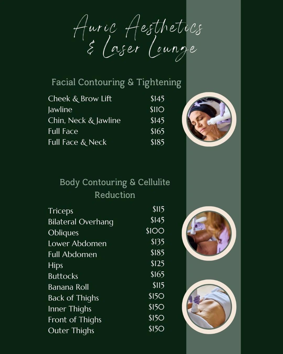 Auric's non-surgical face lift involves a series of treatments using radio frequency technology. We are able to elevate and reposition the brow, cheek, jowl and neck without a scalpel or excisional techniques. Using highly innovative methods, RF energy melts away and effectively destroys fat cells while tightening the skin. The results are dramatic, giving you the shape and beautiful sculpted face you have always wanted